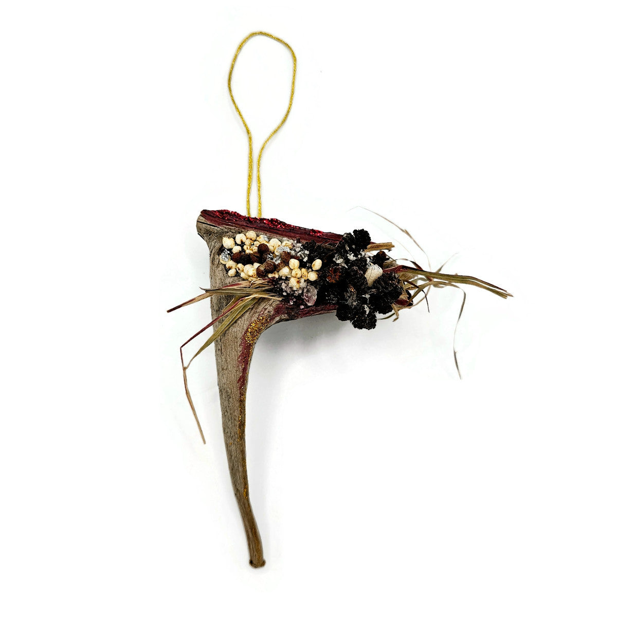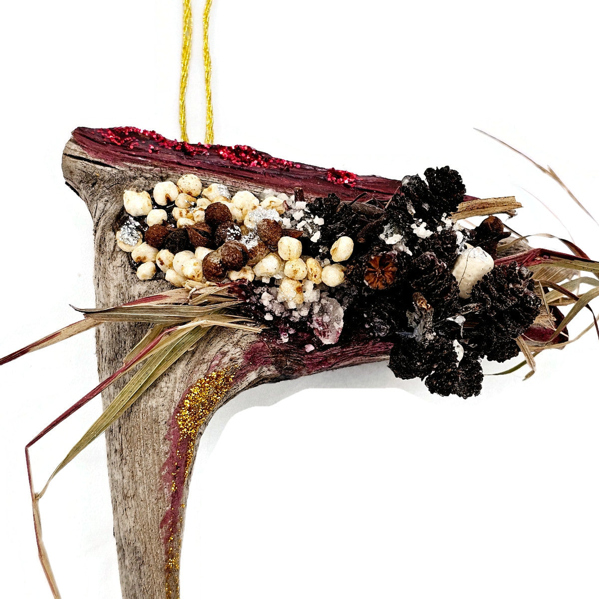 Ornement unique créé par Francine Lasalle à partir de matériaux ramassé dans la nature. À offrir en cadeau, pour suspendre dans votre arbre de Noël, le déposer sur votre table pour agrémenter la présentation, l'accrocher à un cadeau, à une bouteille de vin... L'important est de le partager en gage d'amitié.