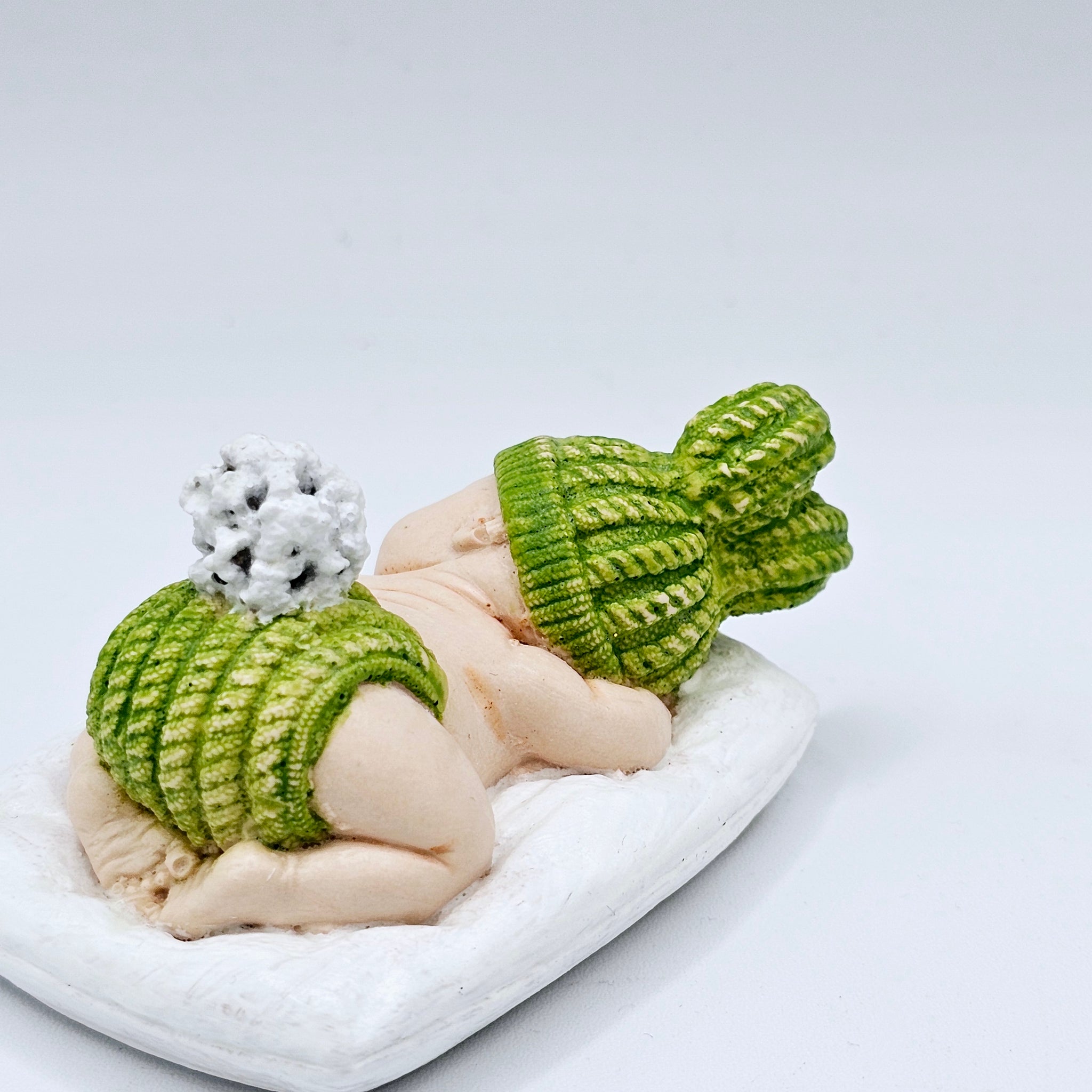 Fabriqué par Caroline la touche-à-tout en jesmonite coulée. Après quoi la figurine est peinte à l'acrylique puis un scellant est appliqué.
