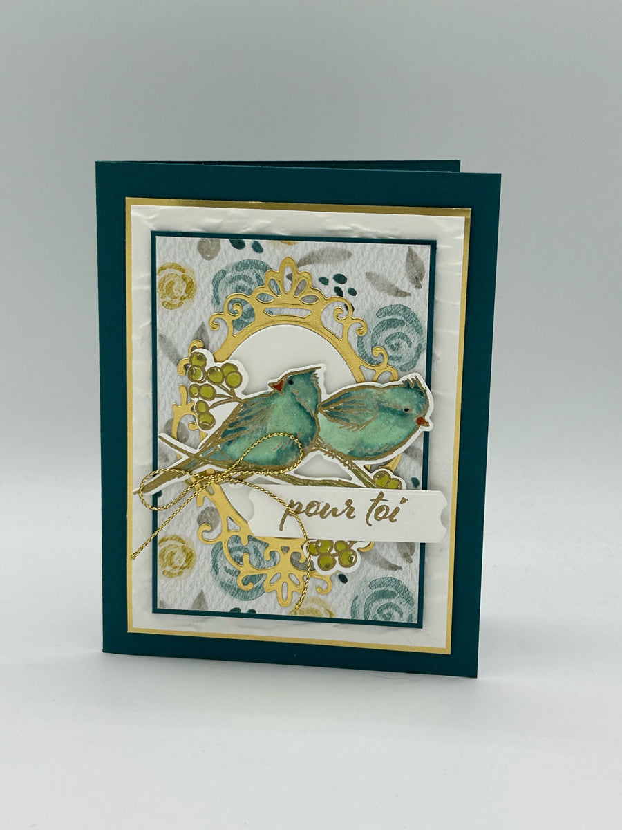 Carte de voeux fabriquée en scrapbooking par Linda Aubut. Différentes techniques ont été utilisées pour créer ce petit chef d'oeuvre : découpe, estampage, superposition, etc...