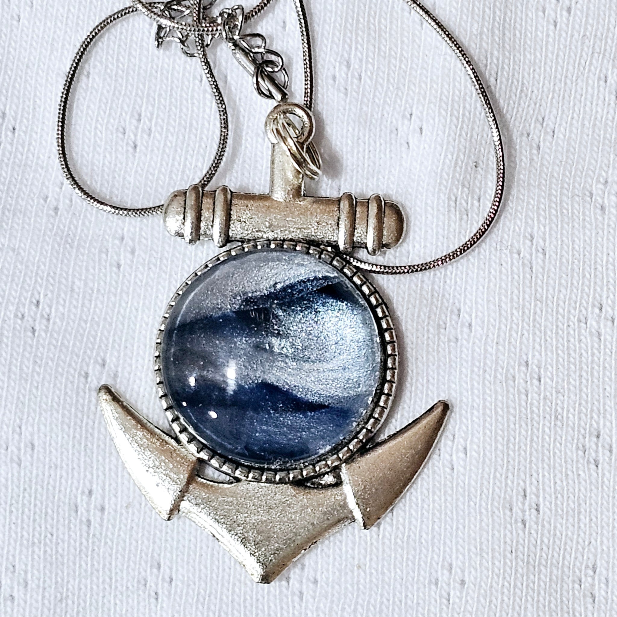 Pendentif en forme d'ancre sur chaine argent & fermoir décoré par Lyne de Créations entre vents et marées. Lyne utilise du sable de plage, de petits coquillages de la résine et d'autres éléments pour fabriquer ses créations.
