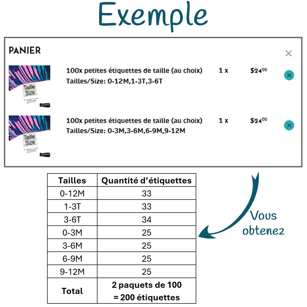 Votre paquet de 100 étiquettes sera divisé en fonction du nombre de sélections de tailles.