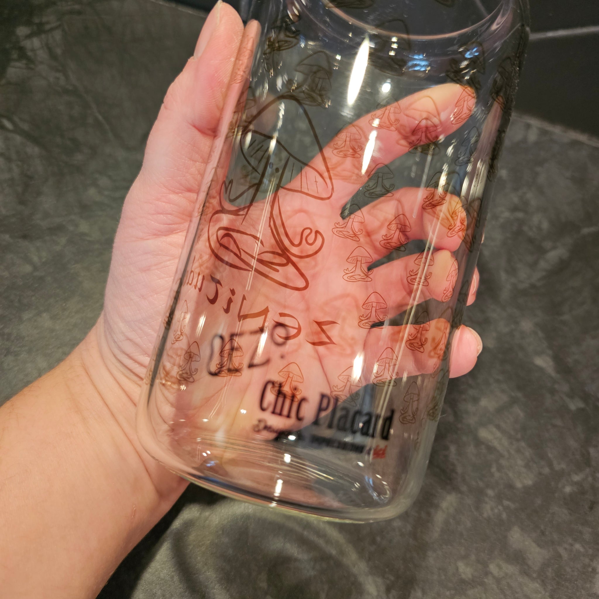 Verre décoré avec une illustration de l'artiste de Matane Oezo et imprimée et appliquée par sublimation par Chic Placard à l'atelier de Matane.