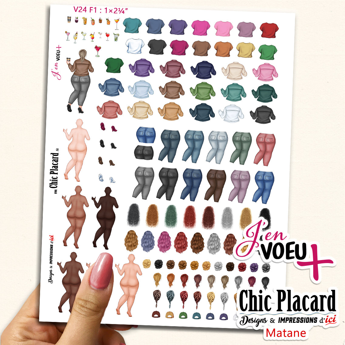 Format ATC cartes d'artiste à échanger. L'ensemble contient 6 corps, 9 pantalons, et plus d'une douzaine de t-shirts et chemises, des cheveux en quantité, 4 paires de souliers par personnage et des breuvages. Le tout à superposer selon vos goûts pour créer des scènes originales.