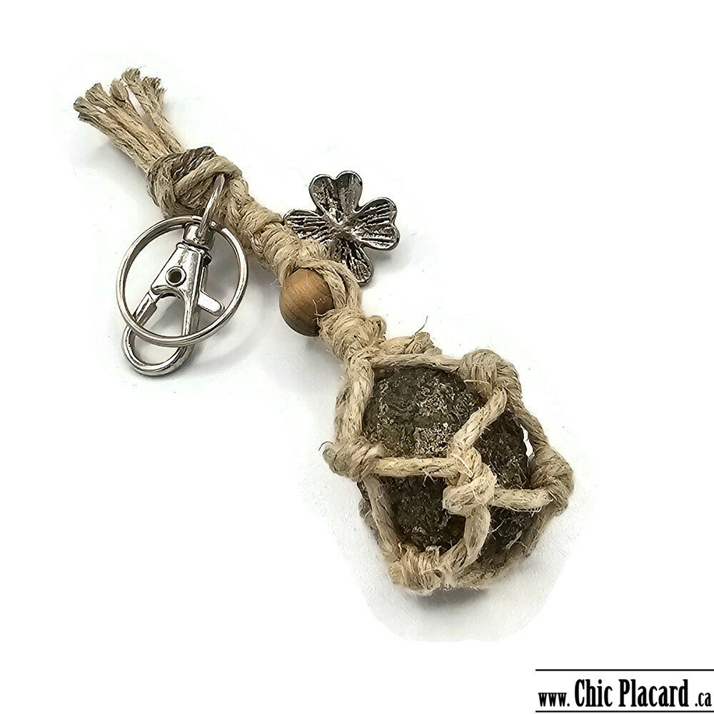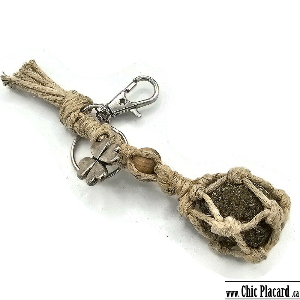 Porte-clé fabriqué à la main avec une pierre de pyrite, de la ficelle de chanvre et des perles de bois teintes de façon artisanale avec des produits locaux.
