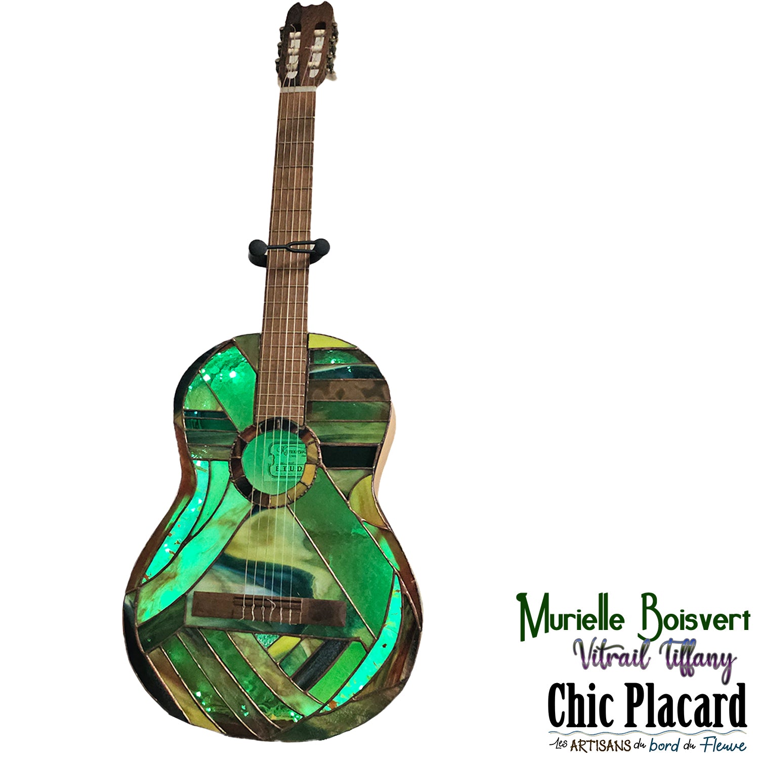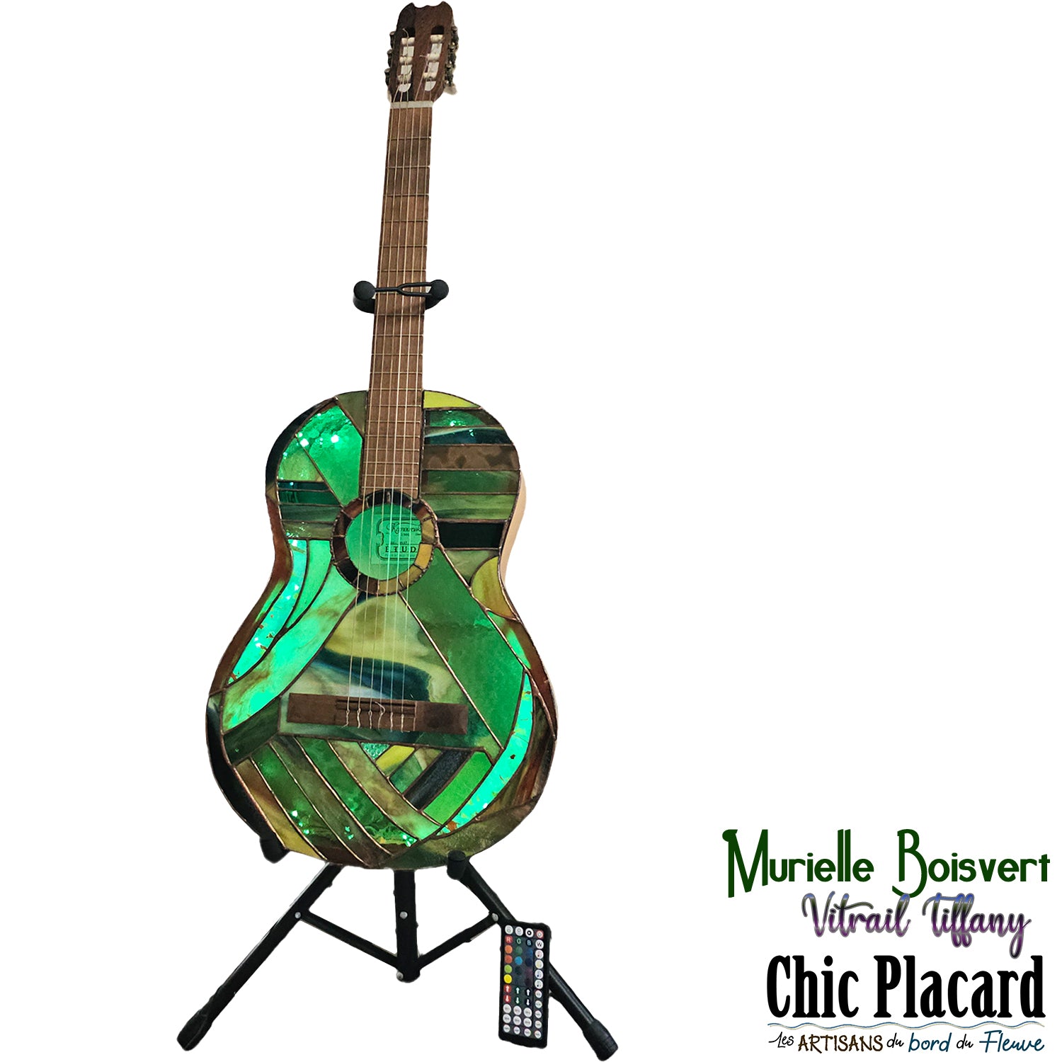 Vraie guitare accoustique recouverte d'une cinquantaine de pièces de verre coloré, assemblés au plomb d'une main de maître par Murielle Boisvert.