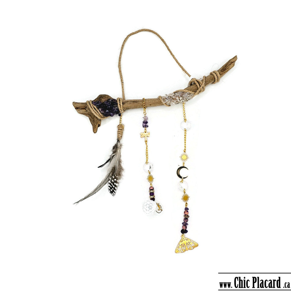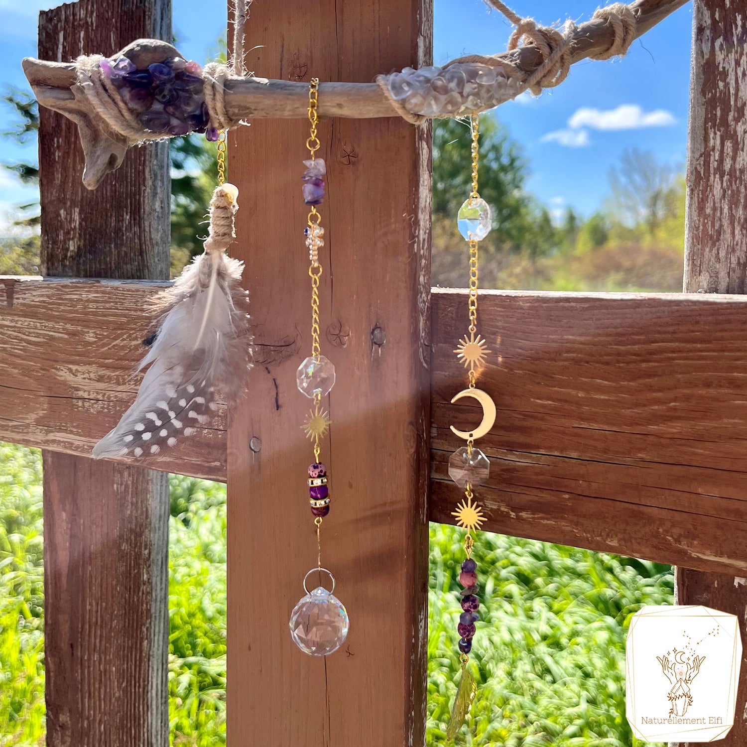 Fabriqué de bois de grève, de pierres & symboles spirituels, ce diffuseur de lumière aussi appelé capteur de soleil fait de magnifiques arc-en-ciel et brille de mille feux lorsque le soleil frappe sur les cristaux, un joli rappel que rayonner soi-même incite les autres à le faire eux aussi.