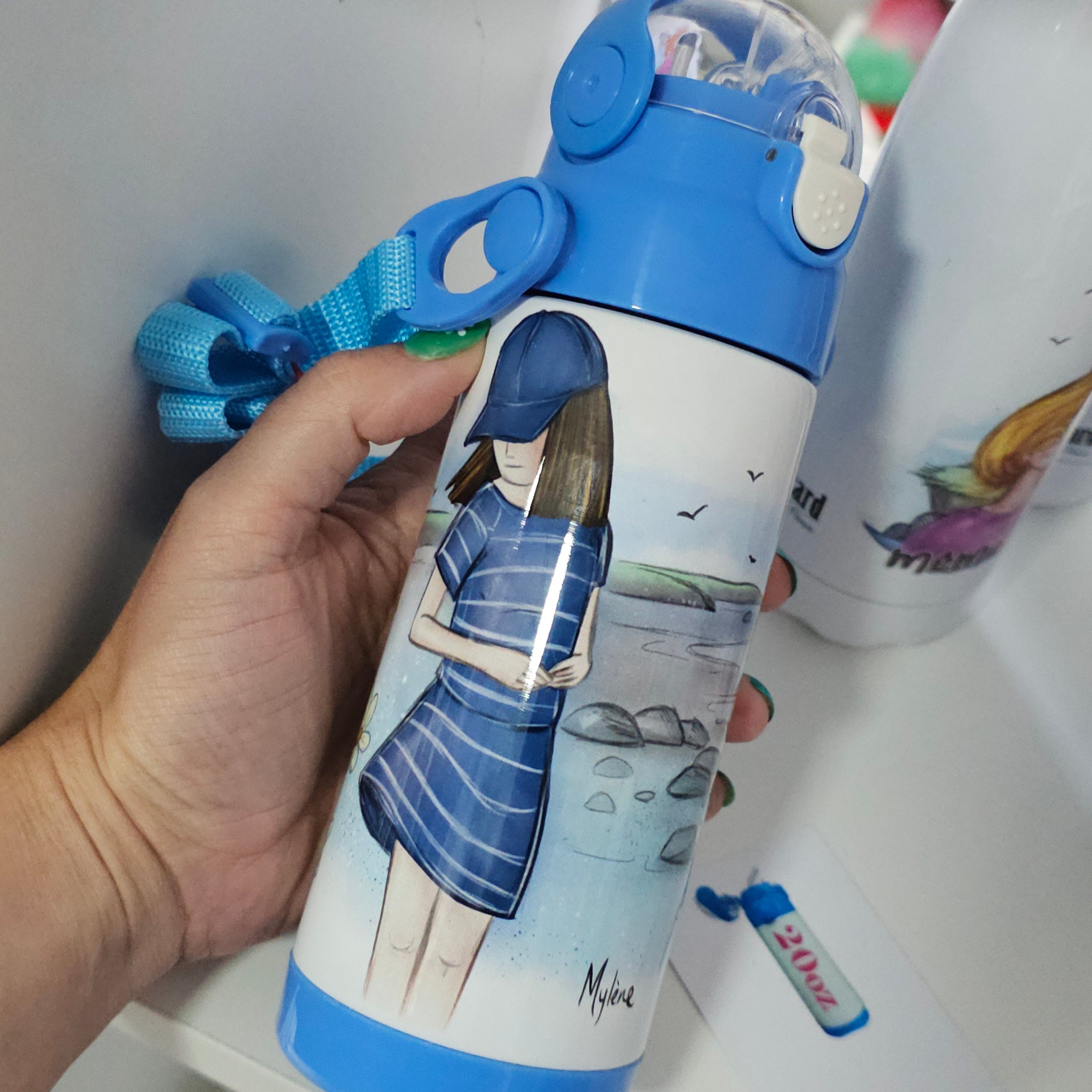 Bouteille décorée avec une illustration de Mylène de Matane et appliquée par sublimation à l'atelier Chic Placard.