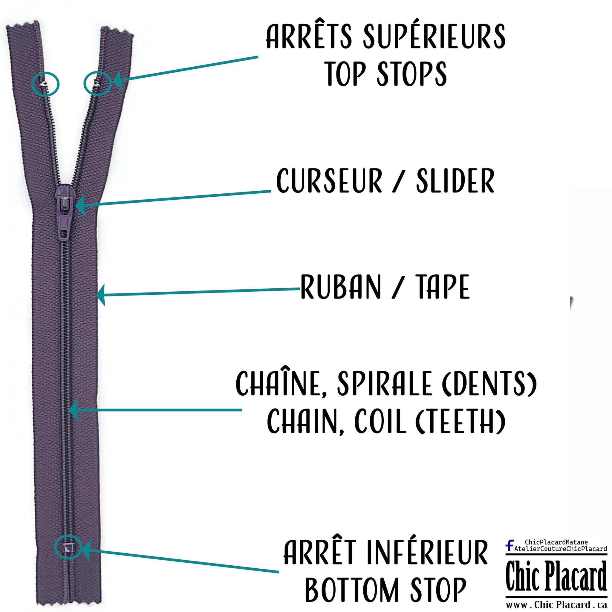 Pour raccourcir ou réparer une fermeture à glissière ( zip / zipper ). Il suffit de pincer l'arrêt avec une pince sur le ruban, en haut du zip pour empêcher le curseur de monter plus haut.