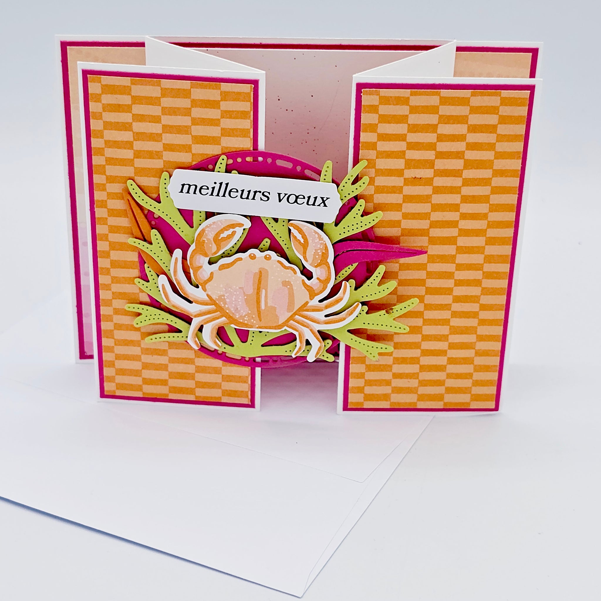 Carte de voeux fabriquée en scrapbooking par Linda Aubut. Différentes techniques ont été utilisées pour créer ce petit chef d'oeuvre : découpe, estampage, superposition, etc...