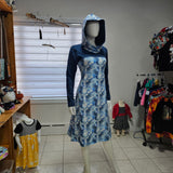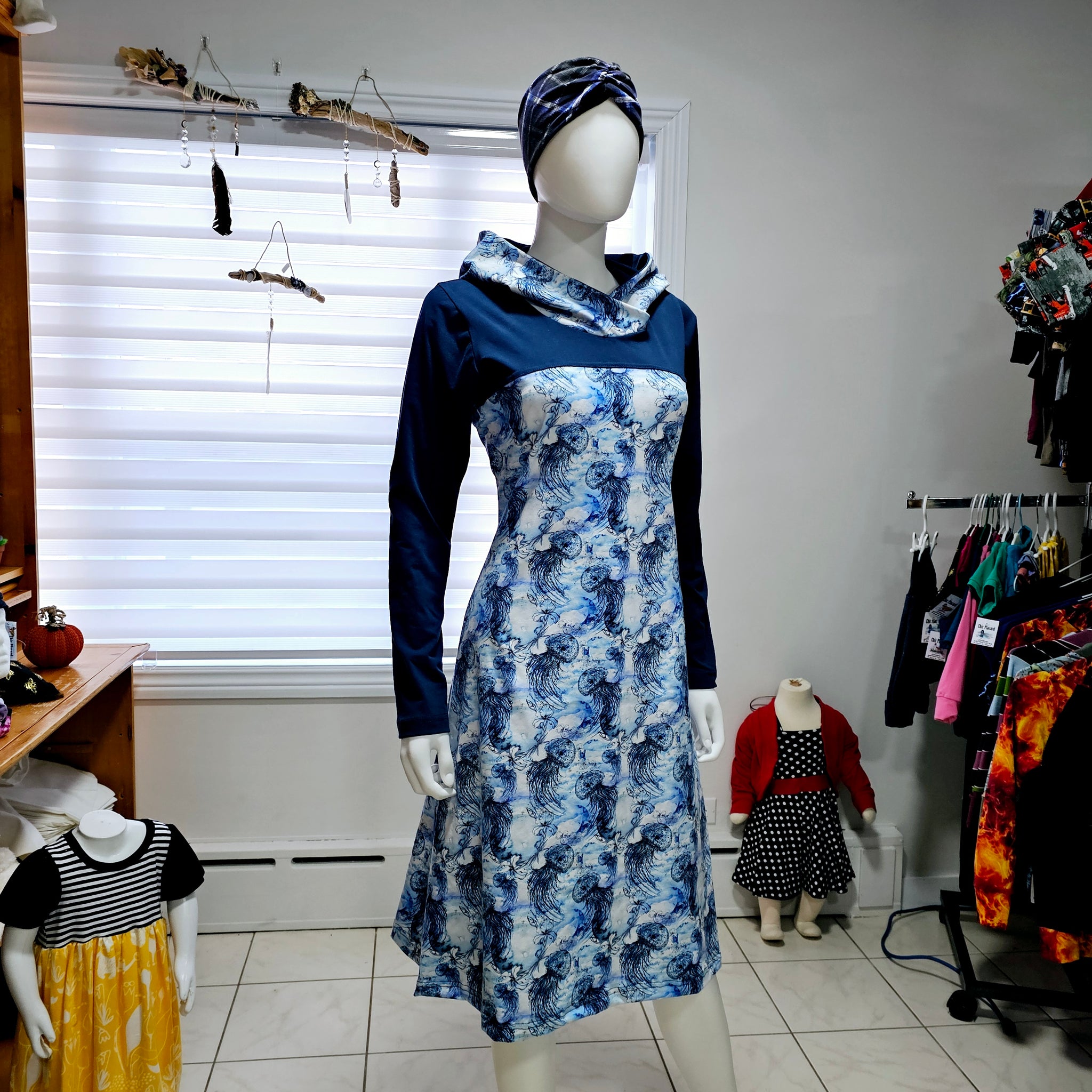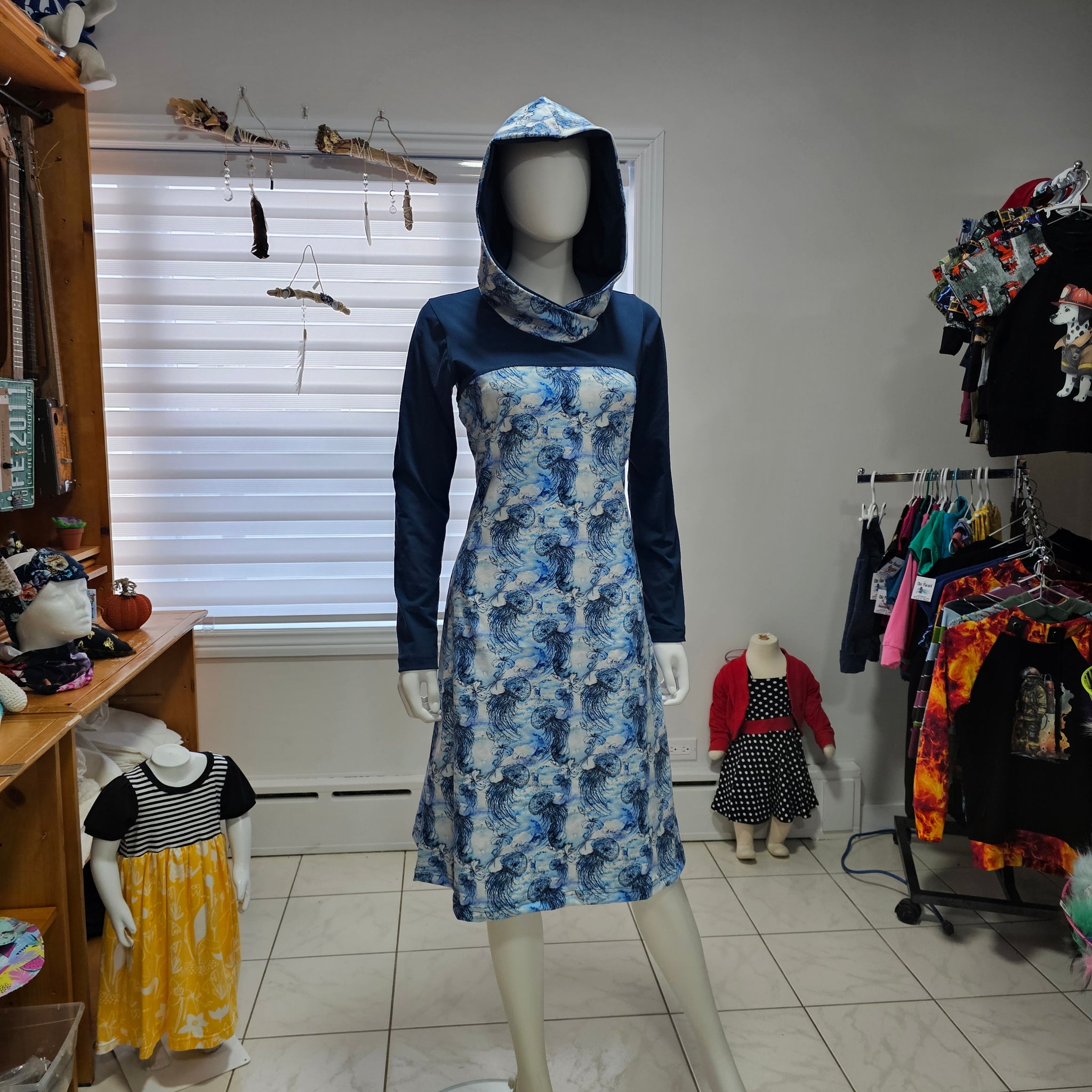 Une robe super confortable et plaisante à porter, qui fait à une multitude de silhouettes. Elle est légèrement ceintrée à la taille et la poitrine est définie par un changement de couleur bien placé. La jupe est évasée. La capuche ajoute une touche de style qui démontre le caractère unique de cette robe.
