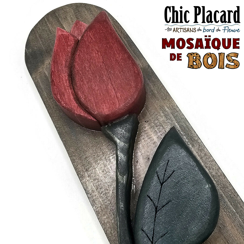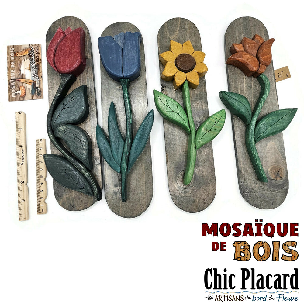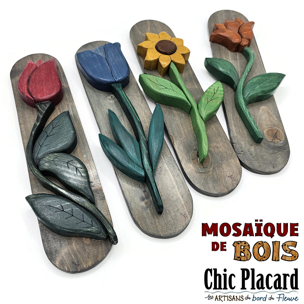 Joël sculpte des morceaux de bois qu'il assemble soigneusement en une mosaïque de bois.  Chacune de ses oeuvres est unique !  Celle-ci est peut-être pour vous ?