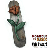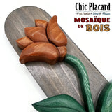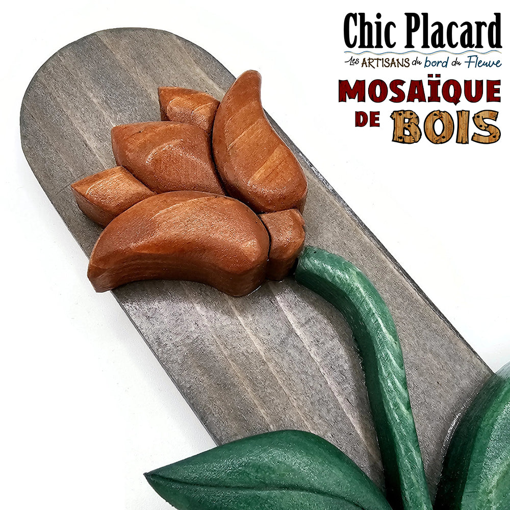 Joël sculpte des morceaux de bois qu'il assemble soigneusement en une mosaïque de bois.  Chacune de ses oeuvres est unique !  Celle-ci est peut-être pour vous ?