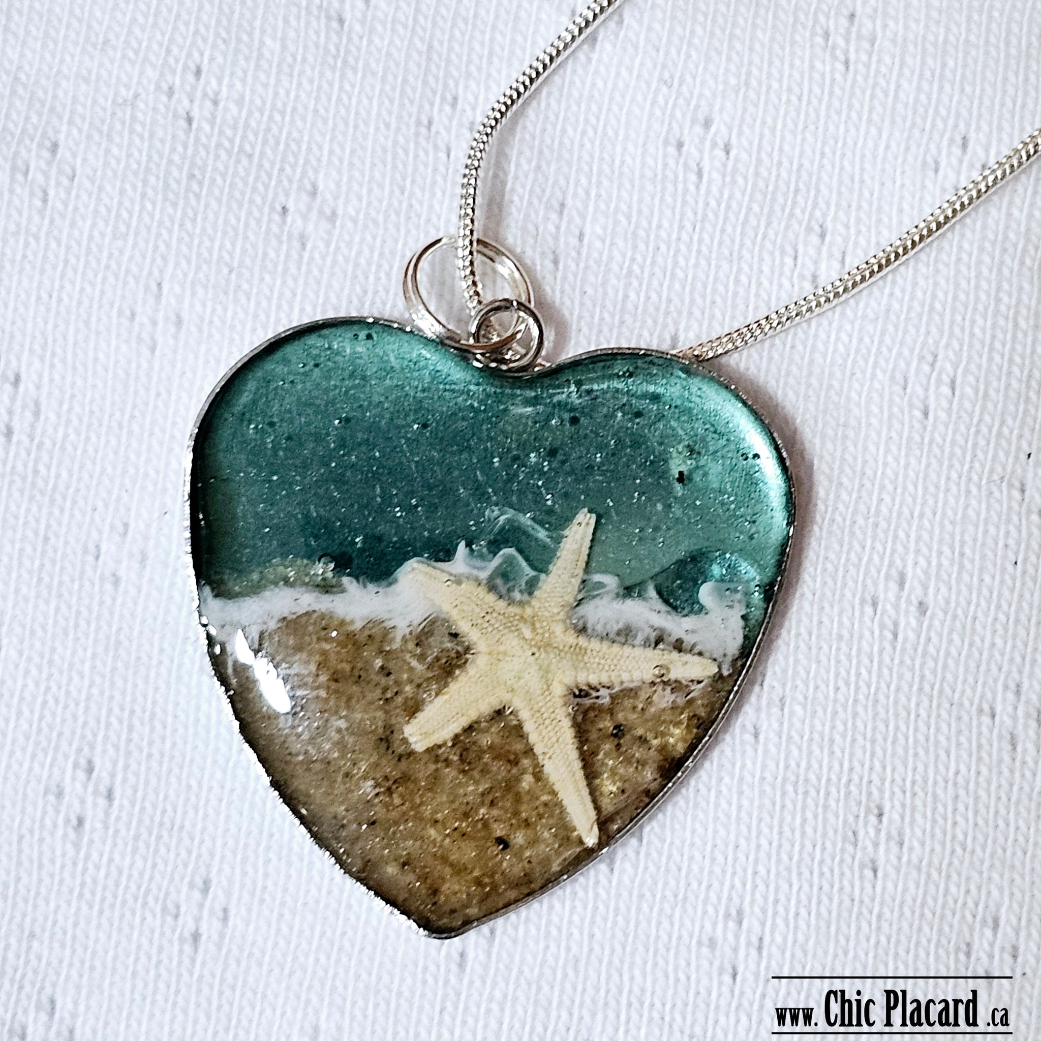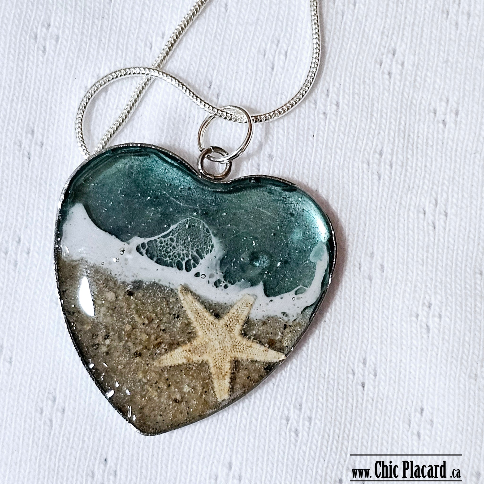 Heart-shaped pendant on silver chain & clasp decorated by Lyne from Créations entre vents et tides. Lyne uses beach sand, small shells, resin and other items to make her creations.
