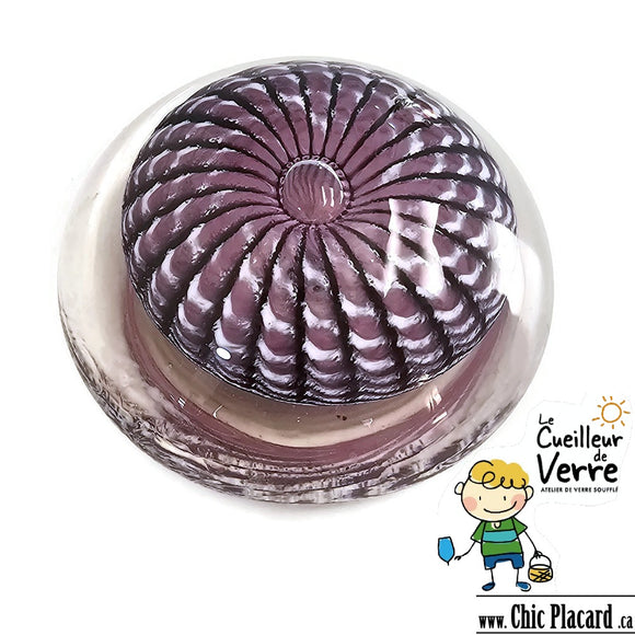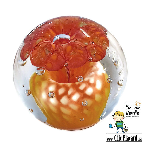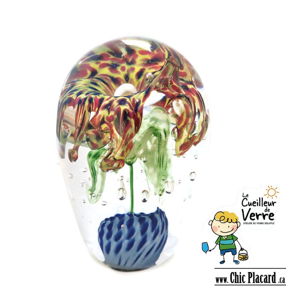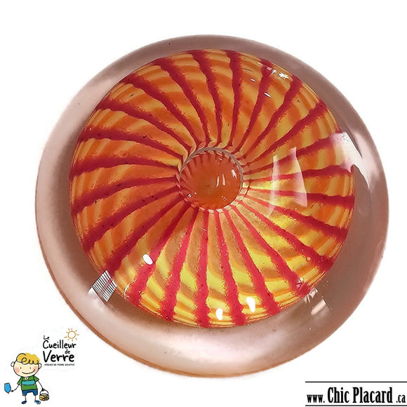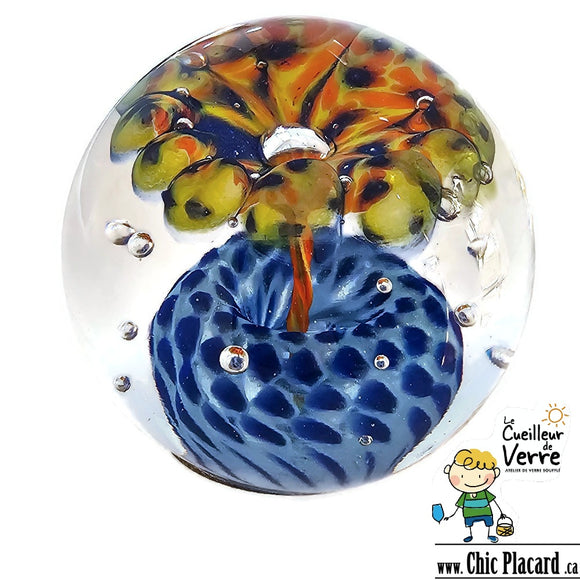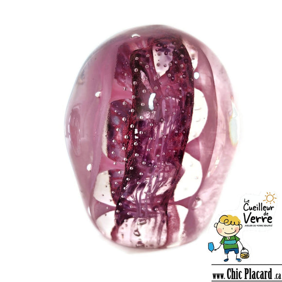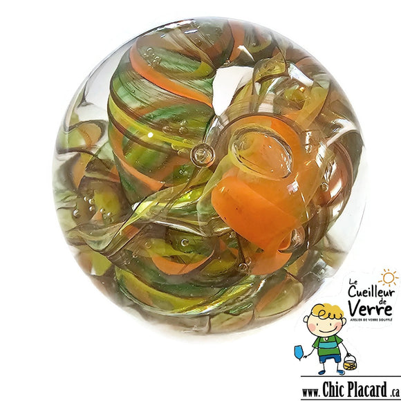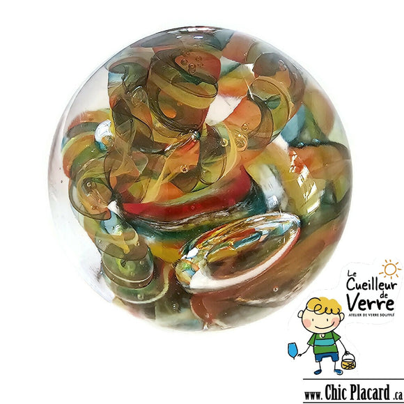 Alexandre is especially interested in hot-formed glass. This technique is rather rare among glass artists. It is worked much like blown glass, except that we do not blow inside the piece in order to keep the glass full. The piece is created layer by layer by adding colors between each. What particularly interests Alexandre in this technique are the very organic shapes that can be given to glass, this very rigid material that we are used to seeing in the form of containers or windows. It allows you to create small universes inside glass balls, each universe is unique and when you observe it for too long you can easily get lost in it.