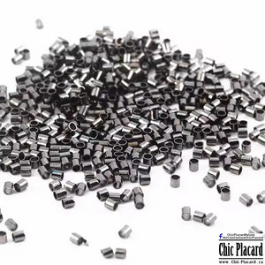 Petits cylindre en métal pour nouer les ficelles lors de la fabrication de bijoux.  Utilisez une pince à sertir pour bien serrer la bague.