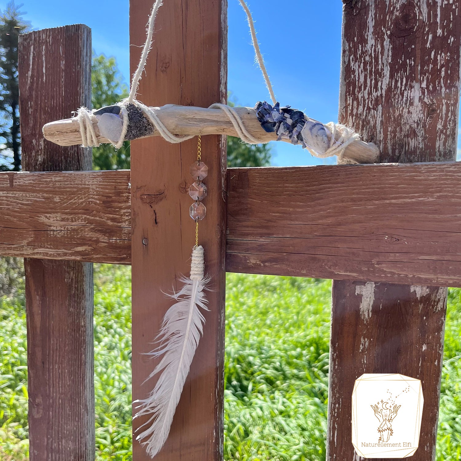 Created with a driftwood stick, stones, dried flowers and feathers. These light diffusers also called sun catchers make beautiful rainbows when the sun hits the crystals.