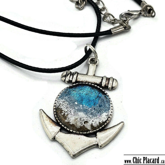Anchor-shaped pendant on black cord & clasp decorated by Lyne from Créations entre vents et tides. Lyne uses beach sand, small shells, resin and other items to make her creations.