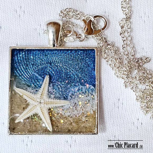 Square pendant on silver chain & clasp decorated by Lyne from Créations entre vents et tides. Lyne uses beach sand, small shells, resin and other items to make her creations.