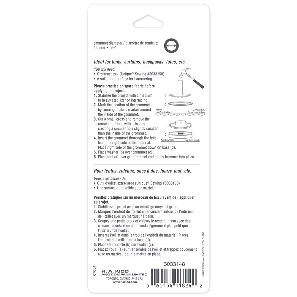 Package instructions. To be used with a hammer and the tools provided in the package, specific to the size of the eyelet to be installed.