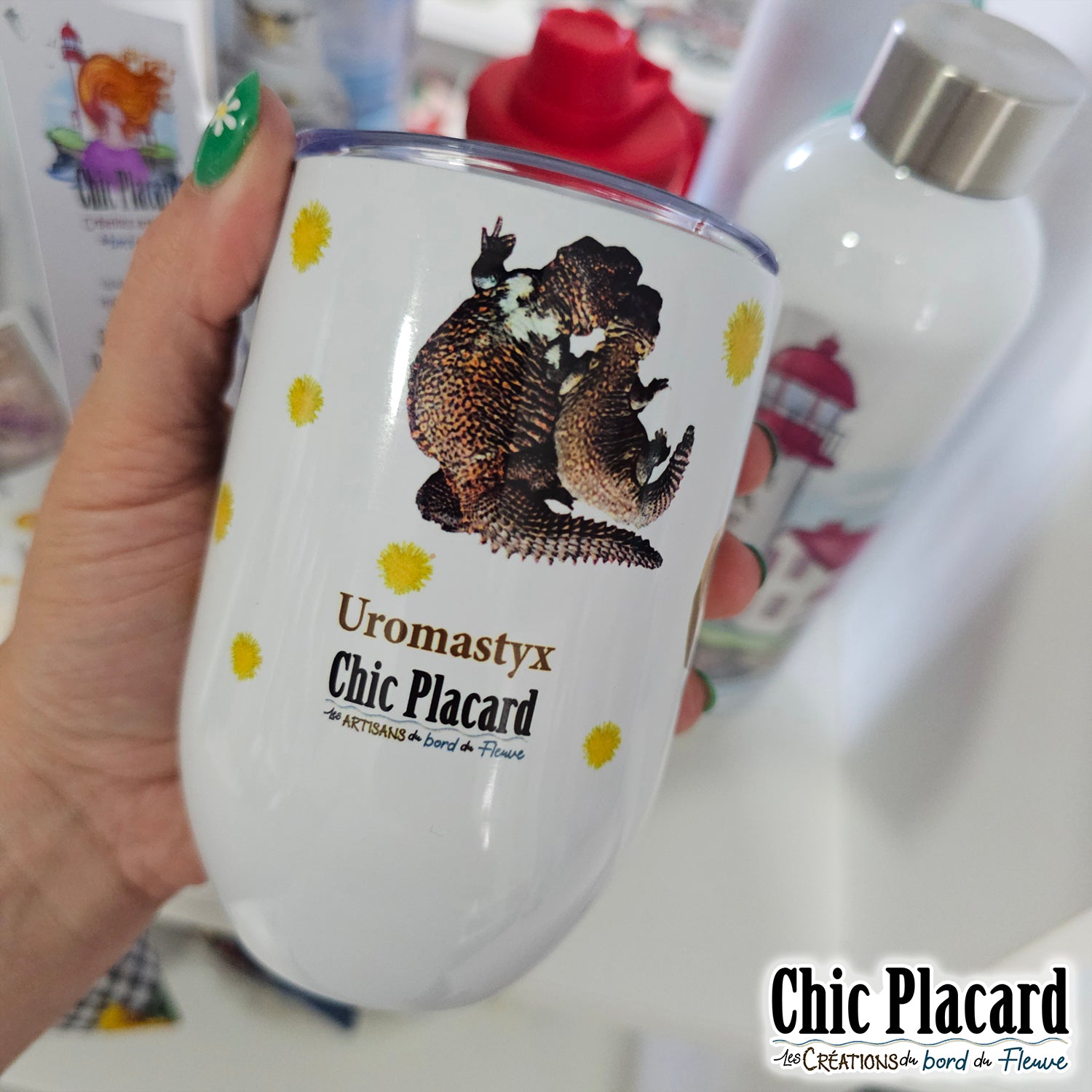 Verre décoré avec des photos prises par Caroline d'un pissenlit et de ses deux lézards Newton et Winnicott, des uromastyx. L'image a été concue, imprimée et appliquée par sublimation par Chic Placard à l'atelier de Matane.