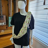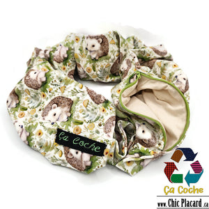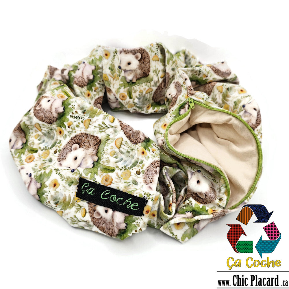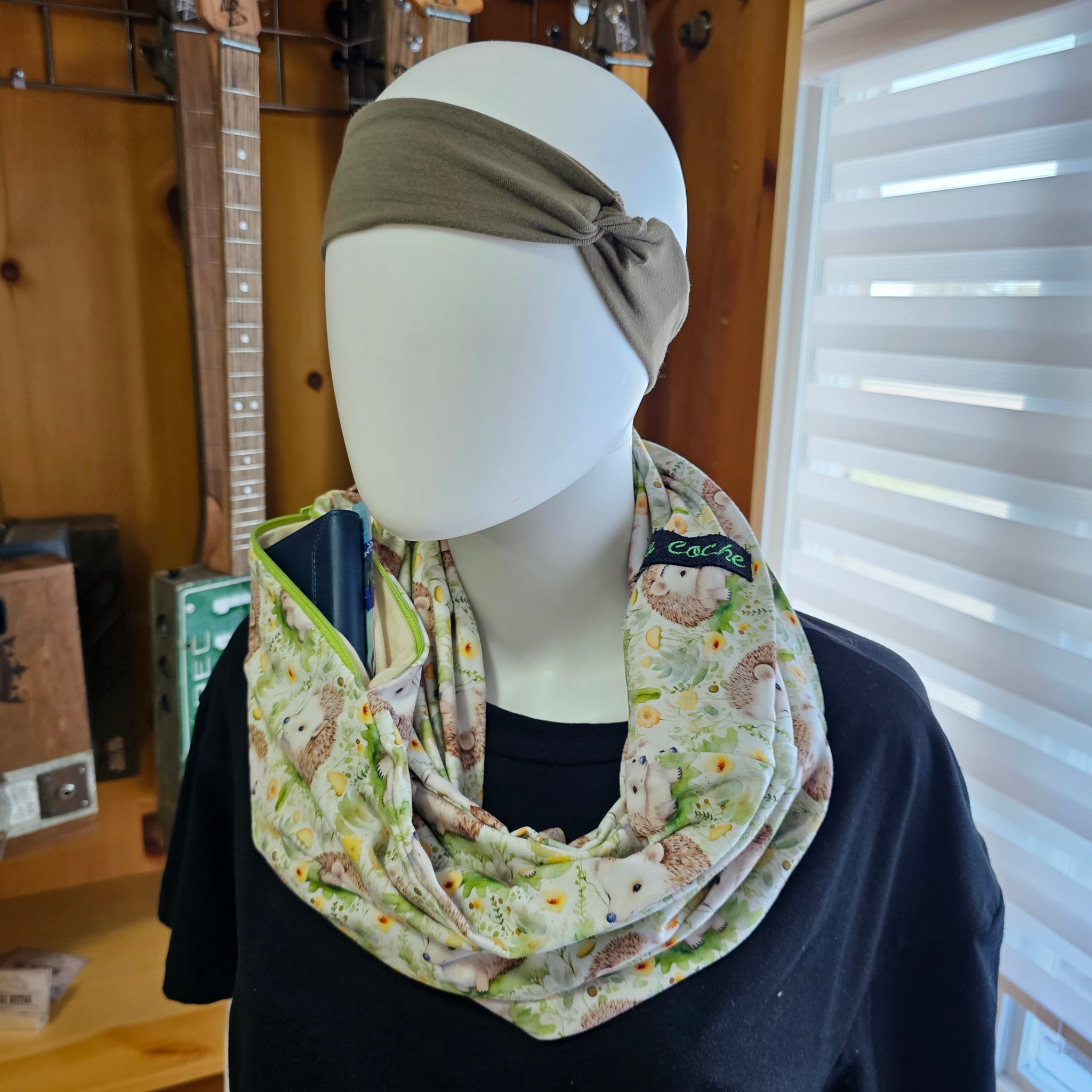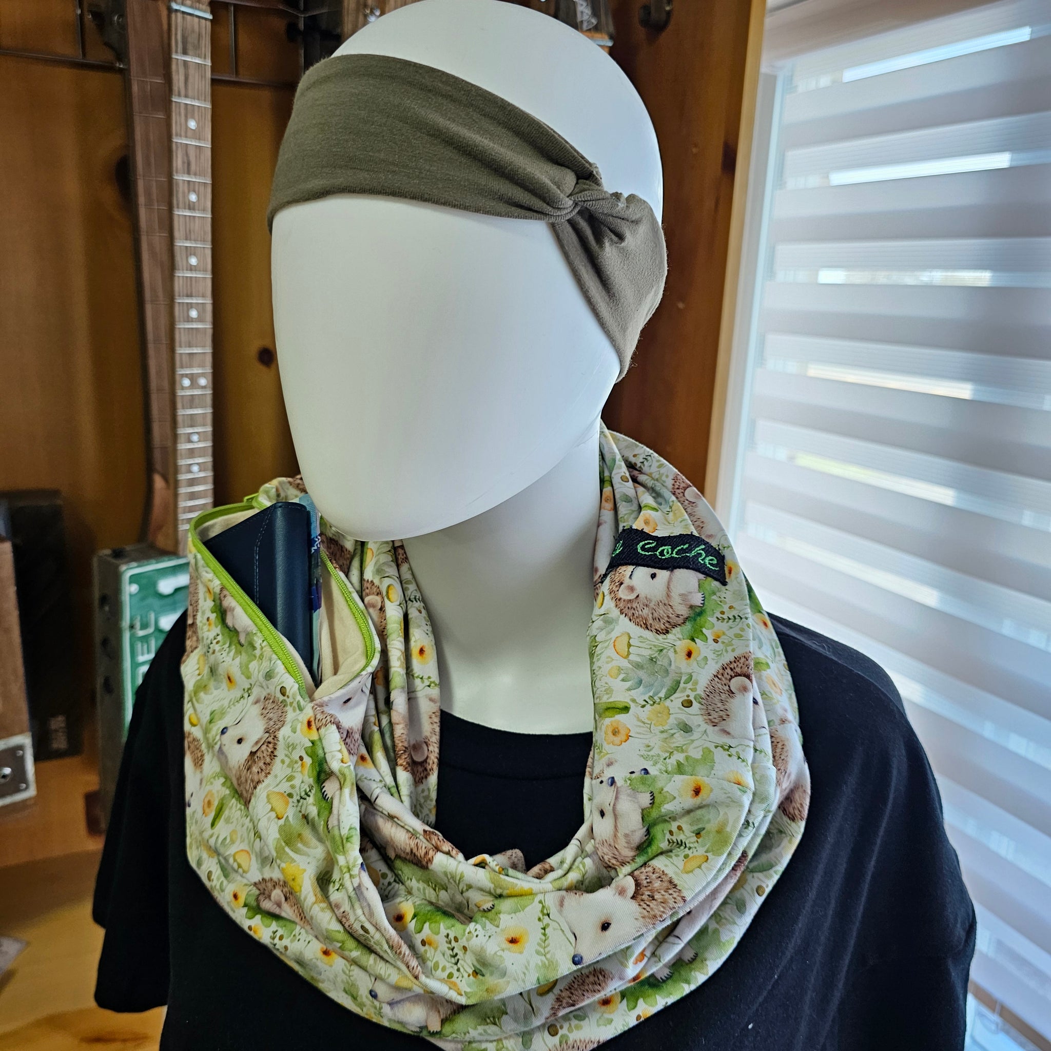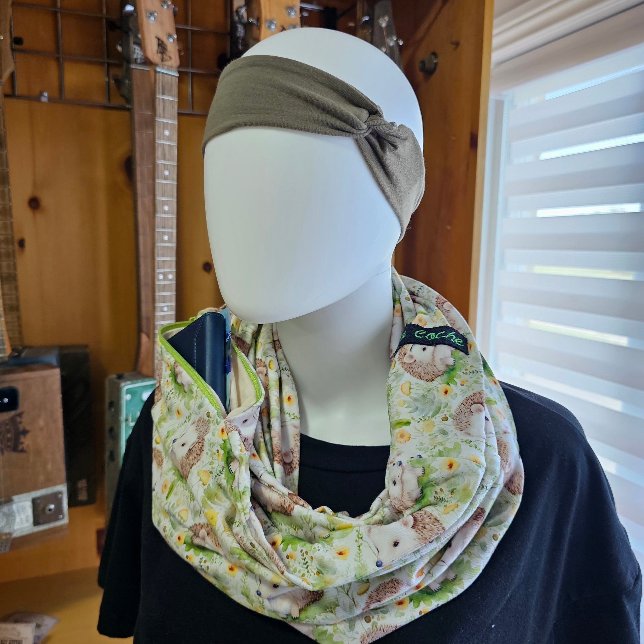 Grand foulard qu'on peut porter sur l'épaule ou autour du cou avec une petite poche cachée qui se ferme avec une fermeture éclair. Vous pouvez y mettre vos clés, votre monnaie ou votre cellulaire. Super pratique quand vous voulez partir "léger" prendre une marche !