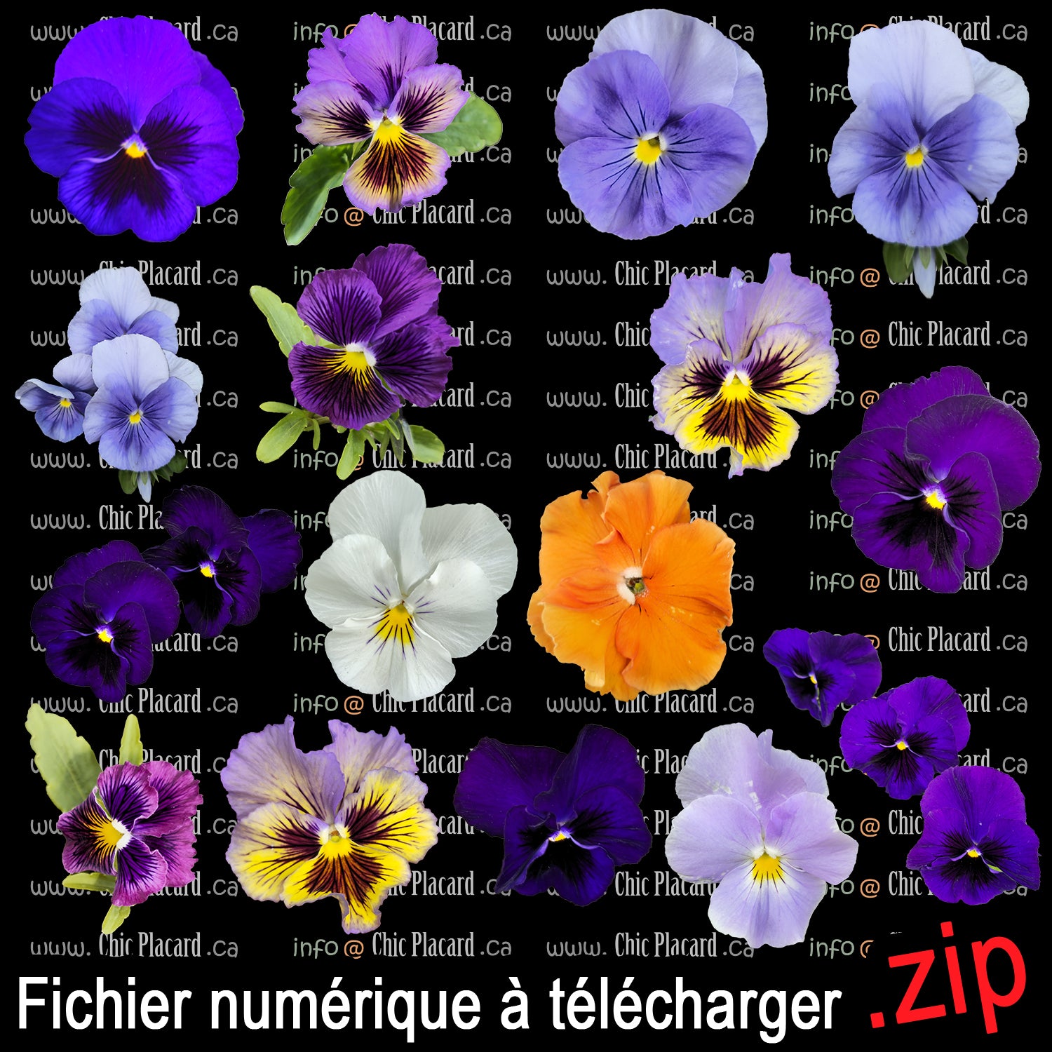 16 photos de fleurs (pensées) prises par Caroline à Matane au Bas-St-Laurent/Gaspésie puis découpées pour créer ces images sur fond transparent.
