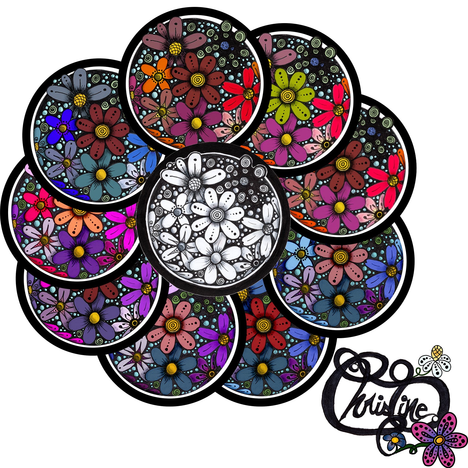 Fleurs colorées - Sous-verre signé Christine