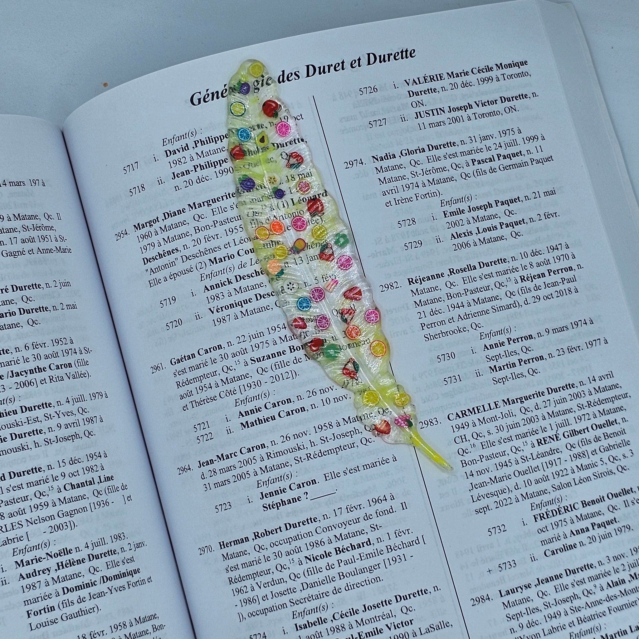 Plume coulée en résine epoxy UV et colorée avec de la poudre qui brille dans le noir et des petites décorations de fruits.