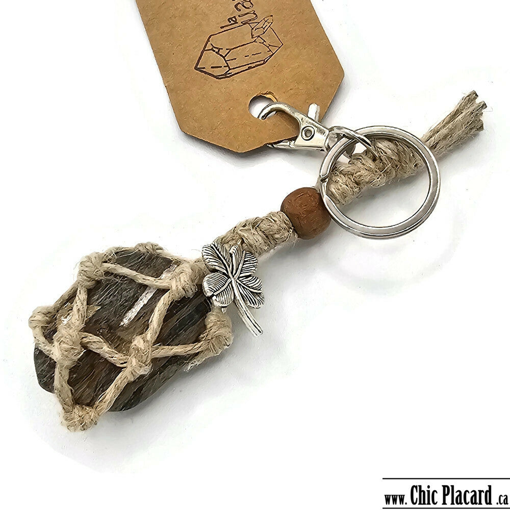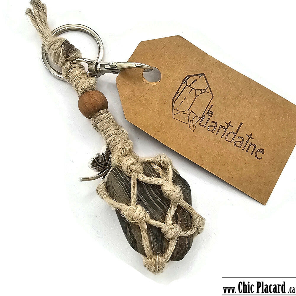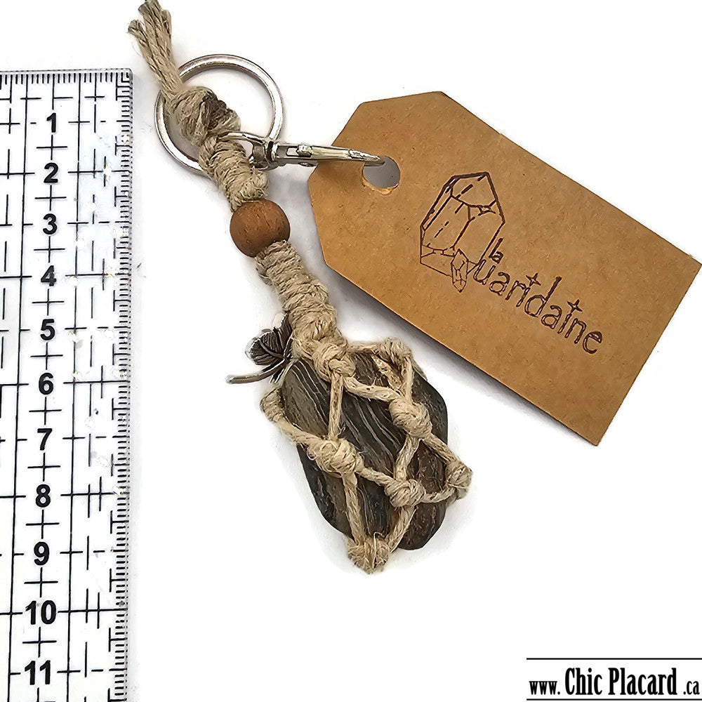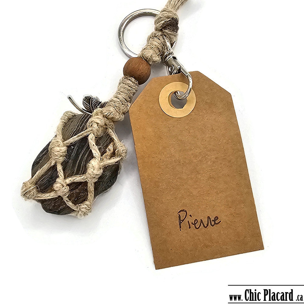 Porte-clé fabriqué avec une pierre, de la ficelle de chanvre tressée à la main et des perles de bois teintes avec des produits locaux naturels.