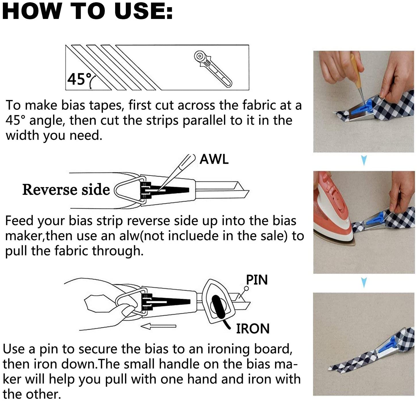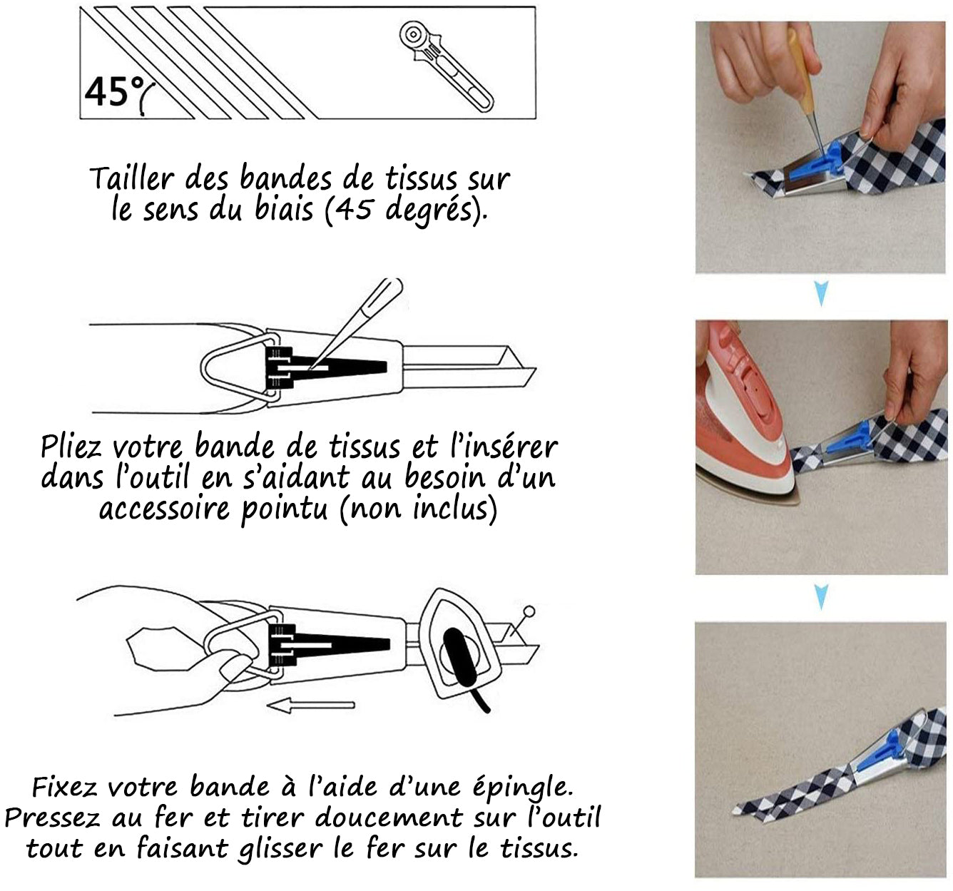 Permet de créer facilement des bandes de biais à largeur uniforme. Vous tirez le tissu à travers et pressez au fer et la bande sera pliée en deux moitiés parfaites.