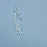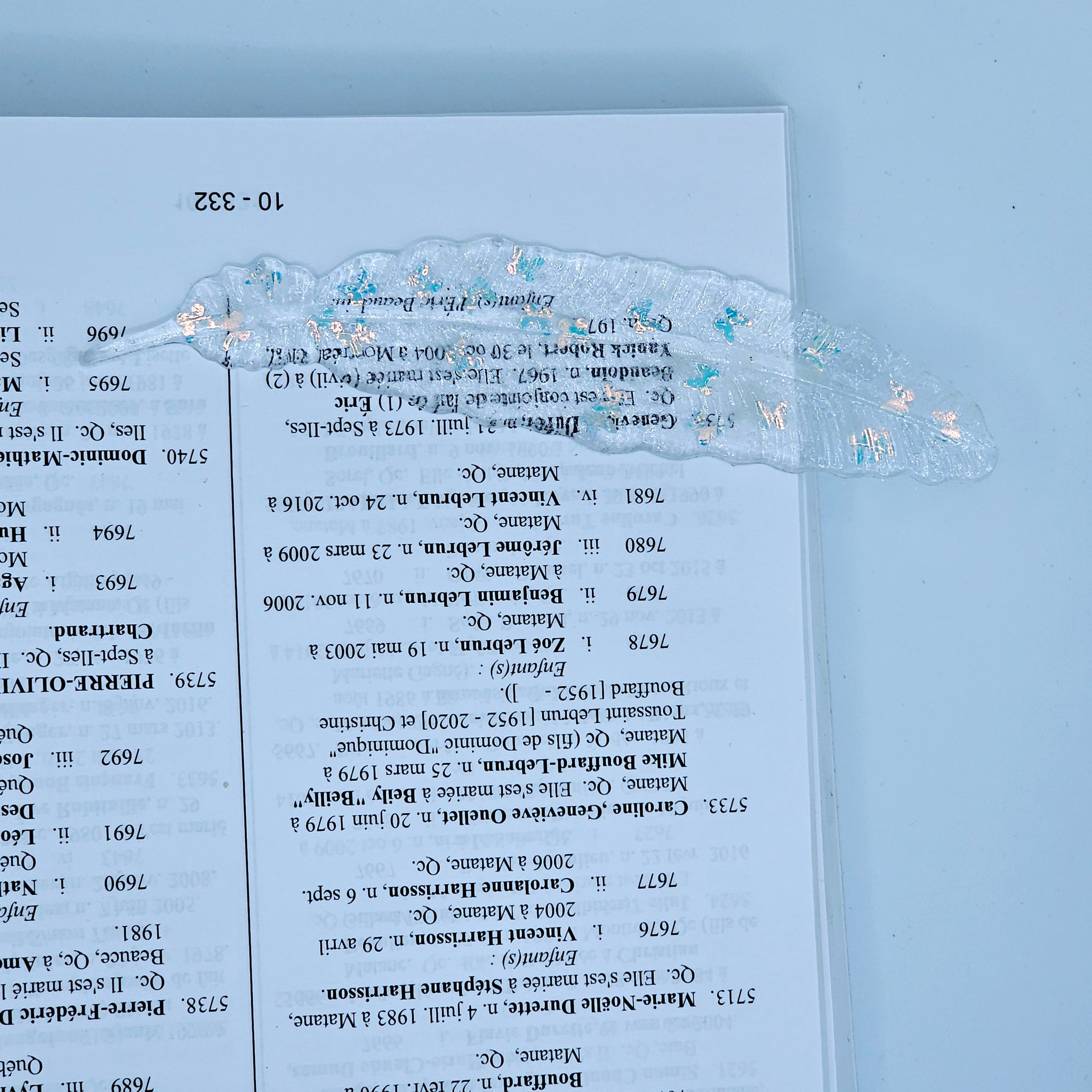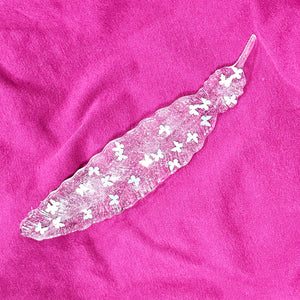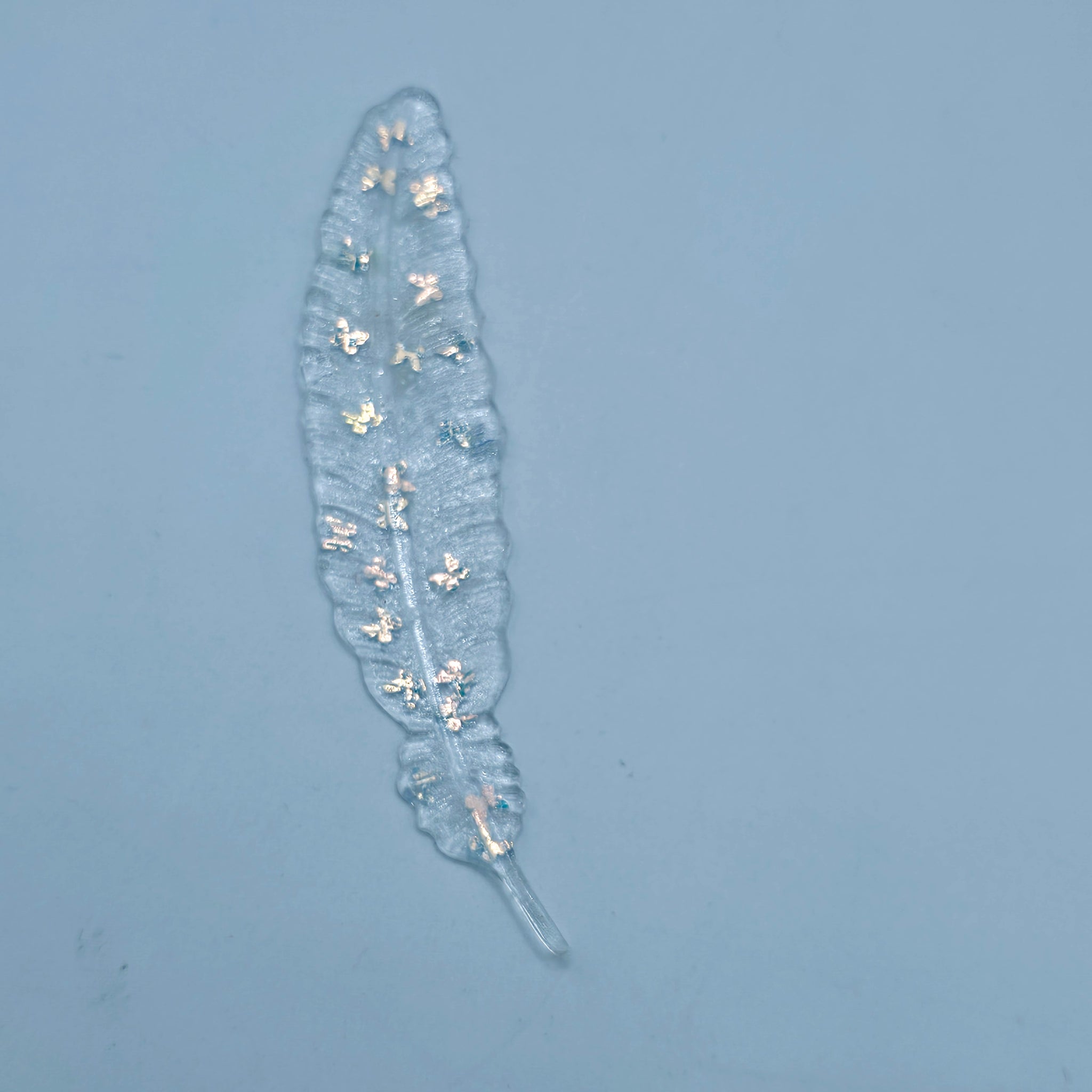 Plume coulée en résine epoxy UV et colorée avec de la poudre qui brille dans le noir et des petites décorations de fruits.