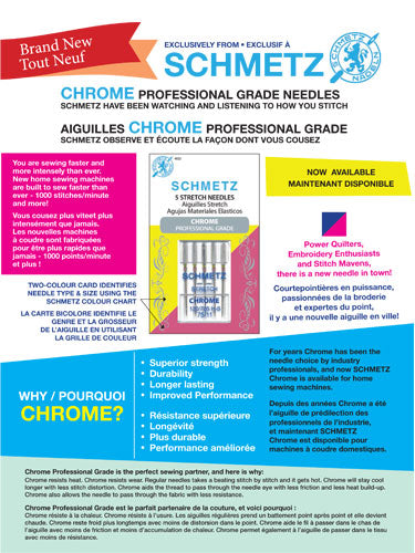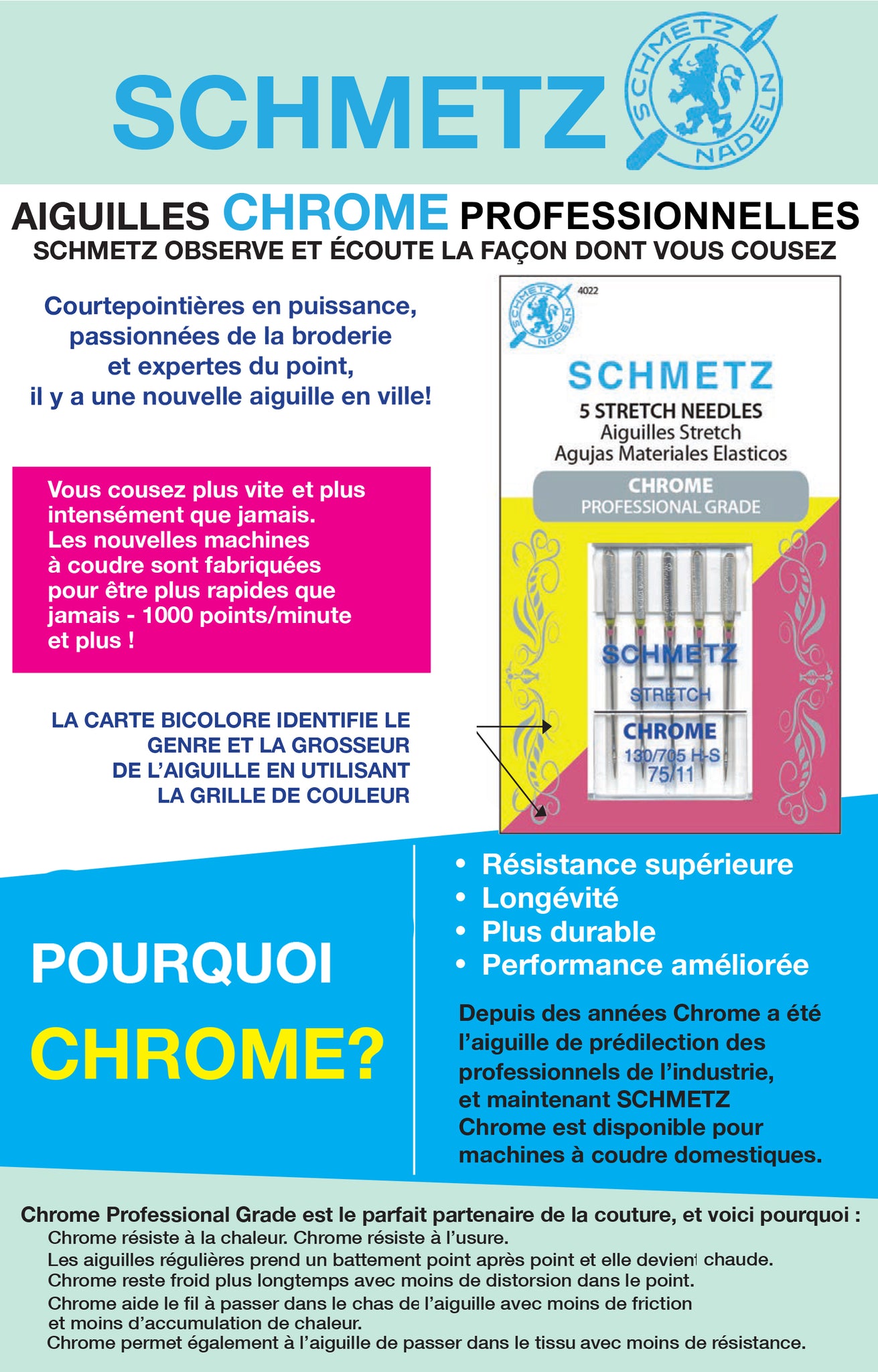 SCHMETZ Chrome Professional Grade est le parfait partenaire de la couture. Chrome résiste à la chaleur. Chrome reste froid plus longtemps avec moins de distorsion dans le point et aide le fil à passer dans le chas de l'aiguille avec moins de friction et moins d'accumulation de chaleur. Chrome permet également à l'aiguille de passer dans le tissu avec moins de résistance.