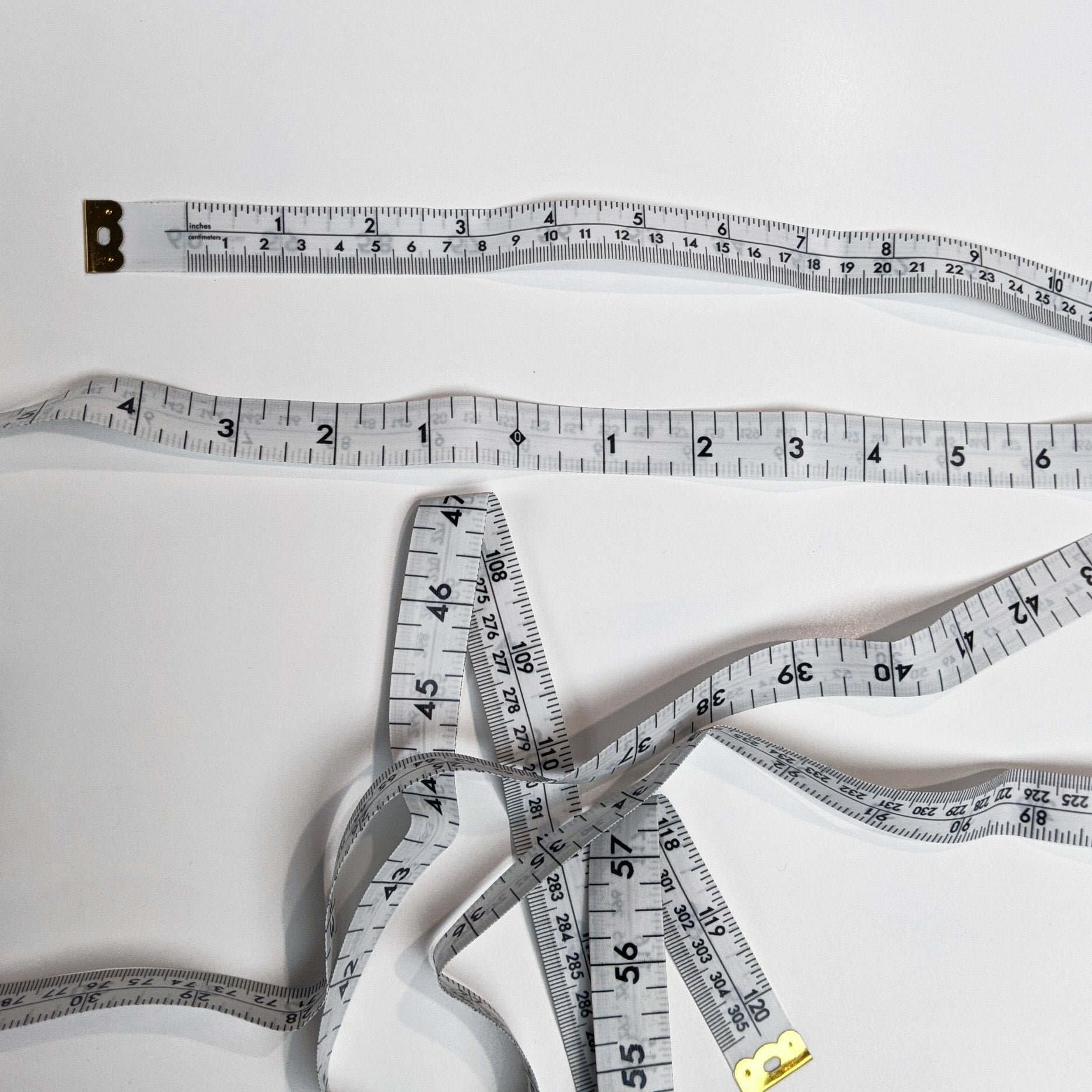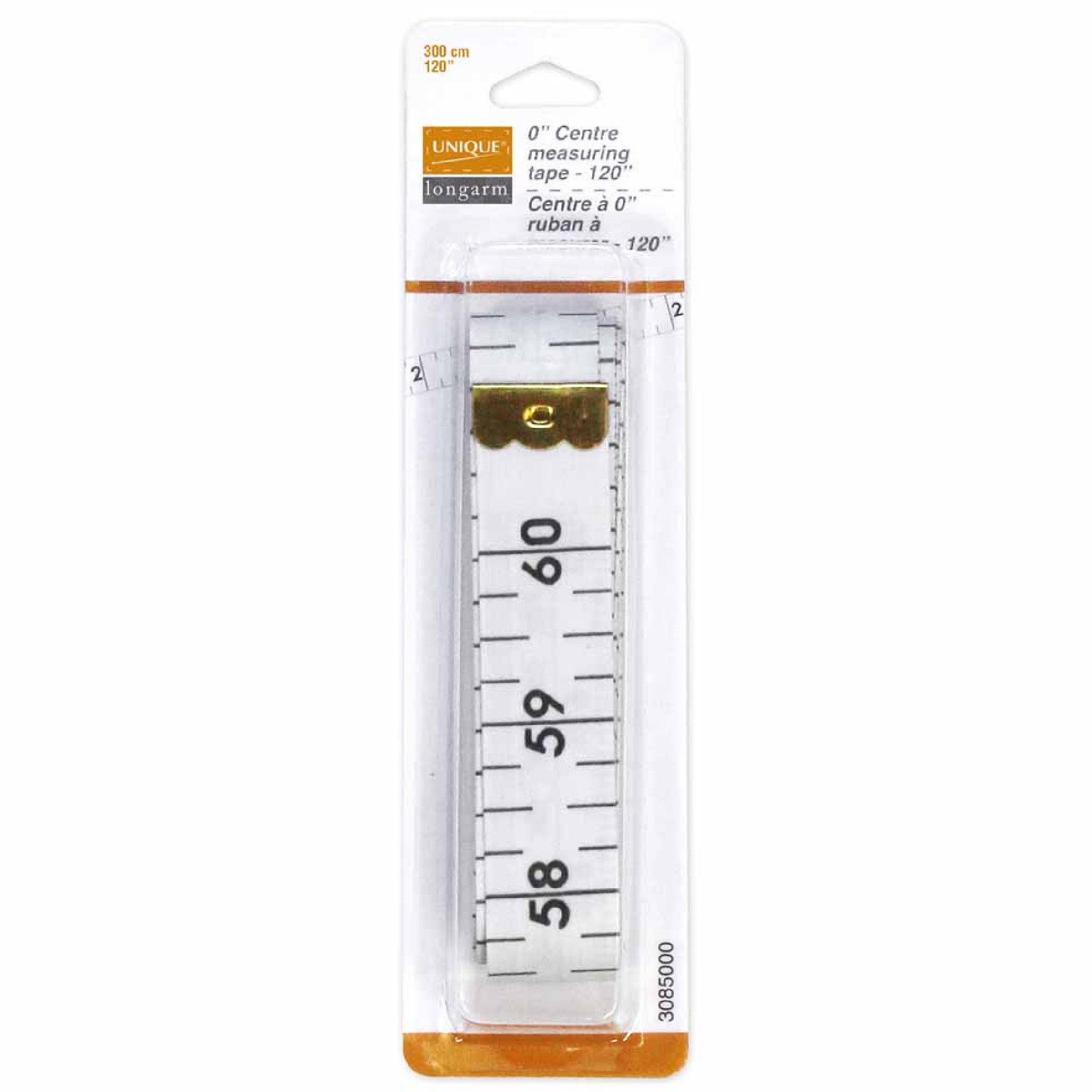 Développé avec un cadre pour courtepointe en tête. Le ruban à mesurer en vinyle double face mesure 120″ x 5⁄8″. Sur un côté, il y a les pouces par incrément de 1/16″ sur un bord et le métrique sur l'autre bord. Sur l'autre côté, le ruban à mesurer est centré : zéro au centre; à gauche et à droite du centre, il mesure de 0″ à 60″ par incrément de 1⁄4″.